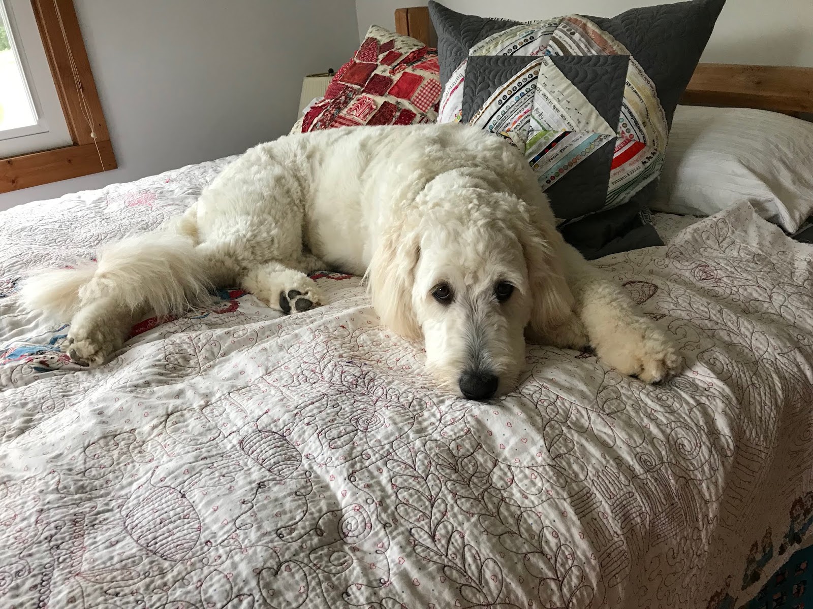 Hazel was chillin' on the loft bed (formally Caleb's bed) this morning. She looks pretty sad about not being able to go swimming the past four days because of the weather. Today isn't looking promising either. The quilt she's laying on was the very first one the kids and I practiced on when I first got the long arm six+ years ago.